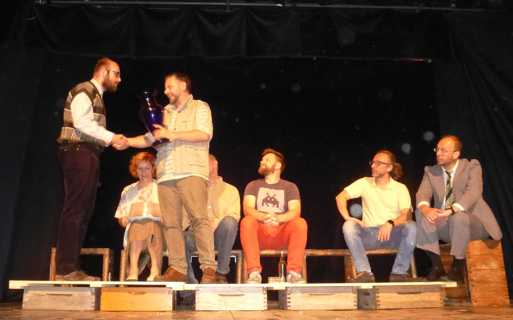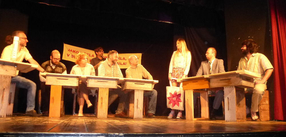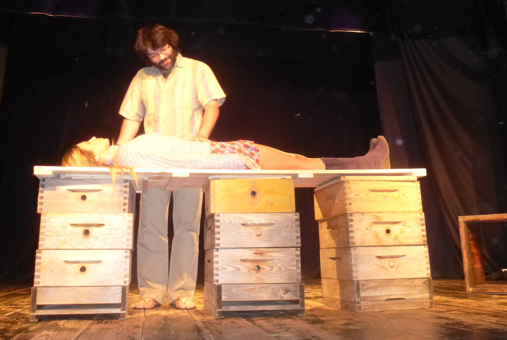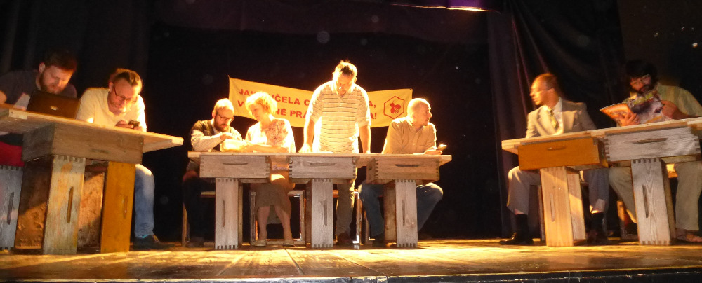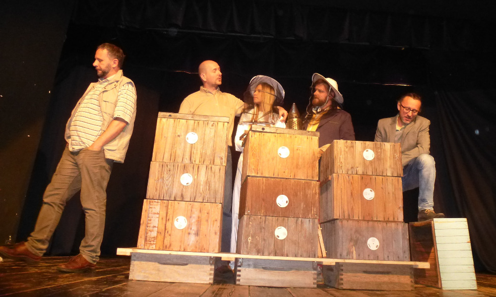 Není mnoho včelařských organizací, které by inspirovaly autora divadelních her, k výpravě představení, zobrazujícího běžný i když svérázný chod jednoho včelařského spolku. Kladenské včelaře a jejich činnost ve svých zápisech již téměř deset let zachycuje a komentuje architekt Jan Červený, mimo jiné i principál divadelní společnosti V.A.D. Nejen včelařská problematika, která je neustále středem sporů a diskuzí, ale i charaktery a postoje všech postav ne nepodobné skutečným osobám, spoluvytváří humorné situace plné nečekaných zápletek a zvratů. Ať již my včelaři, kteří si zde uvědomíme, jak se do naší komunikace prolínají všechny naše povahové rysy, tak i laici, kterým některé postoje a naše problémy musí připadat komické, se nakonec královsky pobavíme nad vtipnými dialogy, nápaditými zápletkami a neočekávaným rozuzlením. Je až s podivem, jak z útržkových dějů, rysů jednotlivých postav a obyčejných lidských vlastností autor vytvořil dílo plné humoru, dojetí i poznání. Dokonale vymyšlená je i tvorba scén, které mění sami aktéři v setmělém sále a za hlasitého zvuku včel. Iluze včelího shonu, spolupráce a pospolitosti je perfektní. Kulisami jsou nástavky, naprosto precizně domyšlené, postupně se měnící z restauračního zařízení na několik včelnic, medárnu, apidomek i včelín. Nepřísluší víc prozrazovat z vlastního děje. Najděte si nejbližší představení na stránkách www.divadlo-vad.cz, přijďte se pobavit a sami posoudit, že podobnost se skutečnými postavami a osudy je čistě náhodná.