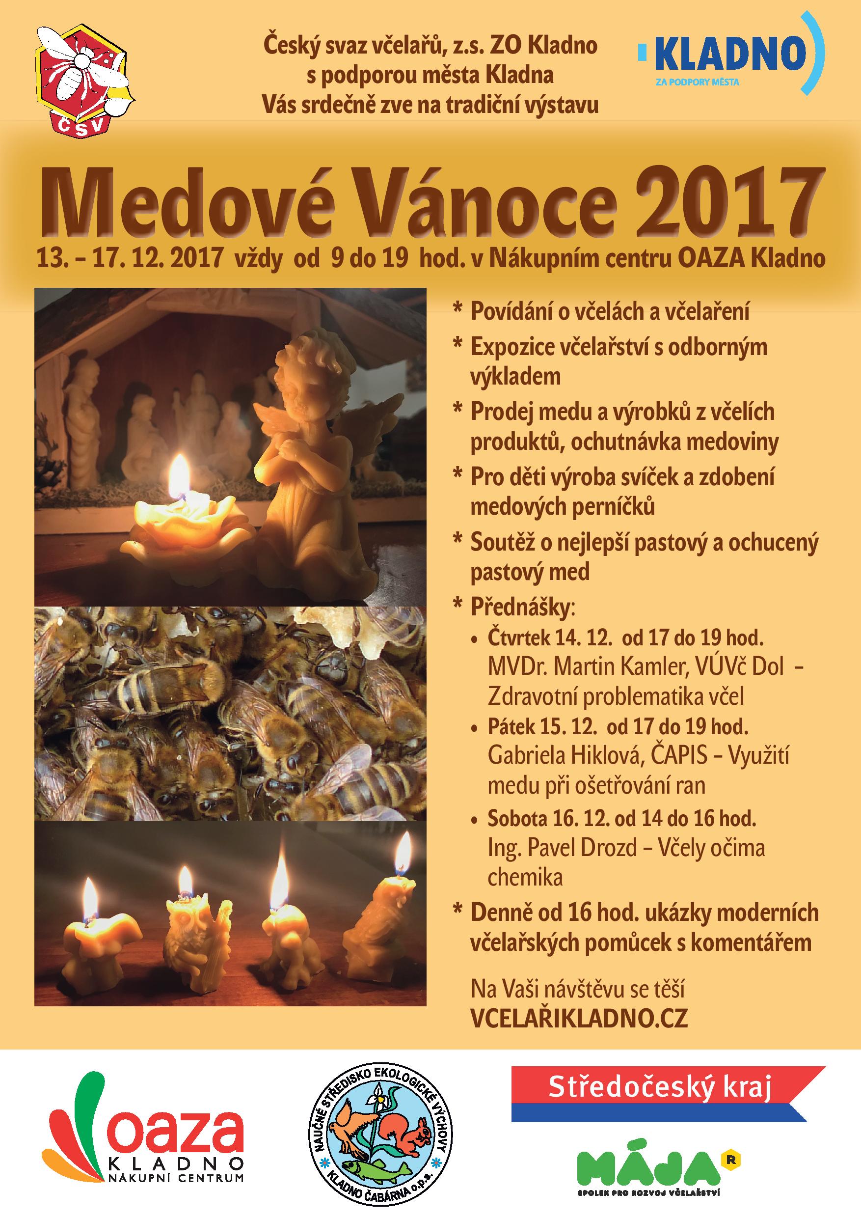 12. ročník osvětové a vzdělávací akce Medové Vánoce se konal opět v NC Oáza, ve dnech 13. - 17.12 2017. Cílem programu tohoto ročníku bylo především vzdělávání včelařské veřejnosti, popularizace chovu a významu včel u dětí a mládeže a rovněž zvýšení zájmu spotřebitelů o nákup včelích produktů od prvovýrobců. Na výstavě se vystřídalo 16 školních kolektivů s 320 dětmi, především z kladenských základních a mateřských škol, ale i zájmových kroužků. Přednášku MVDr. Martina Kamlera na téma zdraví včel si nenechalo ujít 35 posluchačů. Avizovaná přednáška G. Hiklové byla nahrazena RNDr. Václavem Švamberkem na stejné téma – apiterapie (z důvodu onemocnění), a byla sledována 15 účastníky. Sobotní seminář na téma Včely očima chemika Ing. Pavla Drozda sledovalo pětadvacet posluchačů, včetně hostů, včelařů z Lomnice nad Popelkou, ostatních organizací na Kladensku i senátora Mgr. Jiřího Dienstbiera, který se zapojil do předávání cen soutěžícím včelařům. Výstavu za stálého odborného komentáře pořadatelů tak shlédlo více jak 600 návštěvníků, z nichž si i většina odnášela poctivý český med, který zde prodávali jednotliví včelaři, případně se zapojili do vyhodncení 16 soutěžních vzorků pastových medů. Promítání filmů a prezentací zaujalo především děti v rámci širšího programu, doplněného o výrobu stáčených svíček a zdobení medových perníčků. Vlastní výstava byla zaměřena na technické novinky, racionalizaci ve včelařské výrobě a propagaci osvědčených postupů při ošetřování včelstev, jejich šlechtění i zvládání zdravotních rizik. Publicitě akce mezi včelaři napomohla možnost soutěže o hodnotné ceny, kdy nakonec byly připraveny odměny ke každému vzorku medu.