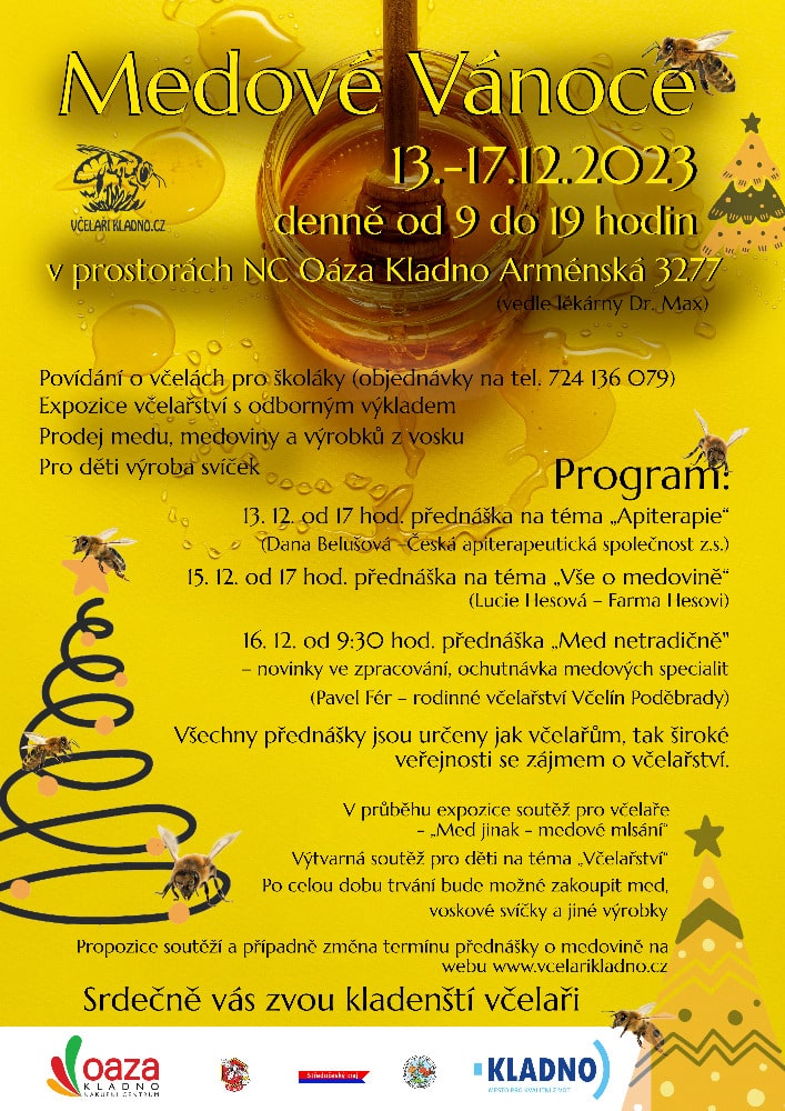 Letošní ročník Medových Vánoc už tradičně probíhal v zapůjčených prostorách v obchodním centru Oáza, opět za vydatné pomoci Naučného střediska ekologické výchovy Kladno - Čabárna a finančního příspěvku od Komise životního prostředí Města Kladna. Velikou měrou se podíleli na přípravě i realizaci jak naši řádní členové, a příkladně též členové výboru, tak naši začínající včelaři z ,,přípravky" na Čabárně. Každé všední dopoledne bylo vyhrazeno školám a školkám, časné odpoledne patřilo zájmovým kroužkům. Dětí v doprovodu 30 pedagogů výstavu navštívilo bez mála na 250. O odborný výklad se postaraly pracovnice ekocentra Dana Belušová a Kristýna Vozná. Tvorba stáčených svíček pak byla doménou Vlaďky Jirouškové, předsedy - Otakara Zdycha a Karla Kočendy, který i vše pilně zdokumentoval. O doprovodný program v podobě seminářů se zasloužili manželé Hesovi, Dana Belušová a Pavel Fér. Jako odměny za výtvarná díla byly připraveny pro děti tematické pomůcky z Lesního světa. Soutěž pro včelaře o medové výrobky měla, k naší lítosti, jen jediného účastníka, paní Lucii Hesovou, která každoročně boduje s velkým sortimentem domácích džemů. A tak i její výrobky obohatily degustační koutek ochucených medů bratří Férů z Poděbrad (včelí farma Včelín), který motivoval jak potenciální výrobce, tak spotřebitele. Škoda jen malé účasti na zajímavém semináři, který navštívili přátelé naší organizace, manželé Rybářovi, až z Lomnice nad Popelkou. Radost nám udělala i účast včelařů z jiných spolků či zapůjčení unikátních exponátů (Včelí stráž). Veliké poděkování patří nejen všem již zmiňovaným, ale i ostatním, kdo pomohli anebo se zúčastnili alespoň jako návštěvníci. Věříme, že spokojena byla i kladenská veřejnost, alespoň pokud lze posoudit podle zájmu o med, svíčky a medovinu. Tak snad zase za rok na viděnou!