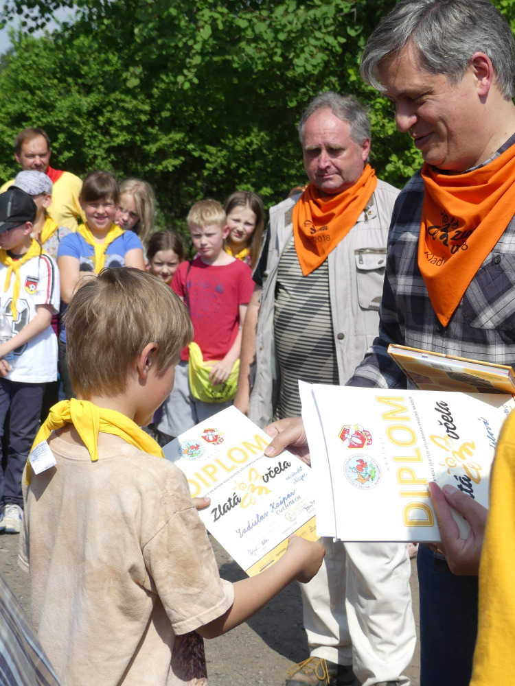Ke zdárné realizaci přispělo nejen krásné počasí a zajímavý areál ekocentra, ale i množství cen, odměn a upomínkových předmětů, se kterými odjížděl každý účastník. Akci finančně podpořili Středočeský kraj, sami Kladenští včelaři prostřednictvím svazu i okresní organizace ČSV, město Kladno, splolečnost AT-Soft, Spolek pro rozvoj včelařství Mája, Včelí stráž, společnost Apinovo, Zámek Koleč-včelařské muzeum, manželé Čermákovi z Vinařic a výrobce úlů, pan Břinek z Jesenice. Soutěžící pak pozdravil a do předání cen se zapojil včelař a senátor za Kladno, pan Mgr. Jiří Dienstbier. Z Kladenských soutěžících se nejlépe umístila Barborka Vlasáková na 4.místě, s postupem do celostátního kola. V neděli bylo soustředění zakončeno teambuildingovými aktivitami v areálu Botanika v Horním Bezděkově. Více fotografií lze najít prostřednictvím odkazu: Zlatá včela 2018 - foto